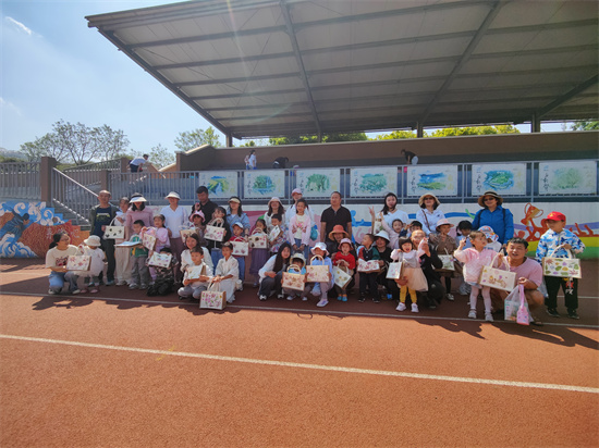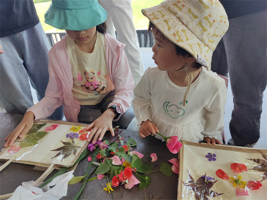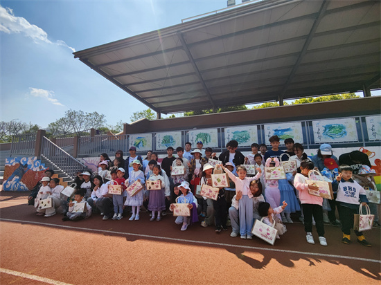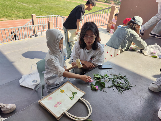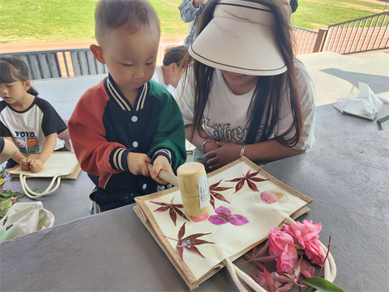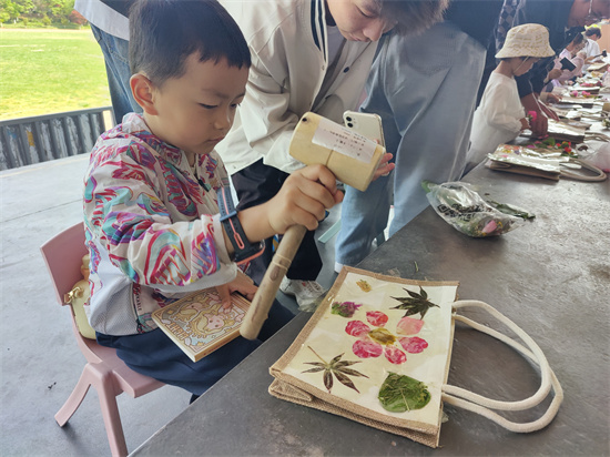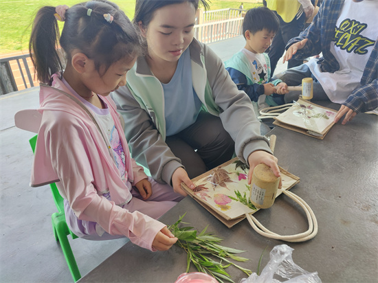 阳光灿烂的足球场上,34名艺术类专业的学生助教在两位老师的指导下,带领28名活泼可爱的小朋友,共同探索了自然与艺术的交融。小朋友们在老师和助教的指导下,亲手挑选植物,轻轻敲打,将自然的印记留在帆布袋上,每一幅作品都承载着他们对大自然的敬畏和对生活的热爱。