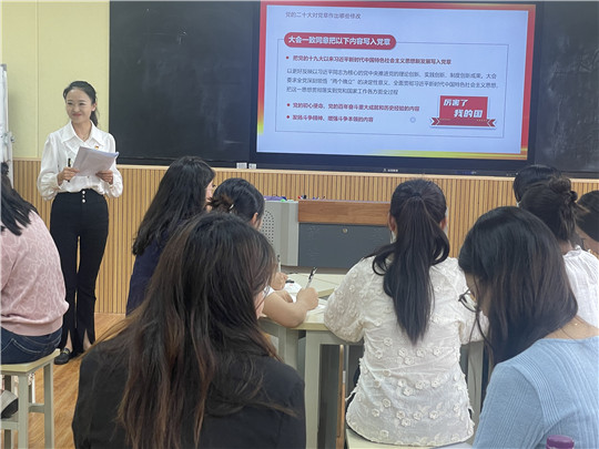 为深入学习贯彻党的二十大精神,切实做好党员创新理论学习,教育引导广大党员同志增强“四个意识,坚定“四个自信”,做到“两个维护”,不断提高政治判断力、政治领悟力、政治执行力,充分发挥党员先锋模范作用。根据《中共云南云南工程职业学院委员会关于开展党员领导干部“七一”前到所在党支部挂钩联系点讲党课活动的通知》安排,教育学院党支部邀请党委委员、宣传部部长邓艳超同志,于2023年6月13日下午在1教614教室开展以《中国共产党章程》为主题的专题党课。此次专题党课由教育学院党支部书记李扬同志主持,支部全体党员参加。