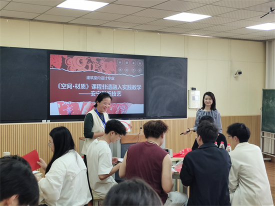 建筑室内设计专业的仕如玉老师从专业角度出发,讲解了刻纸与《空间·材质》课程的融合。《空间·材质》课程致力于培养学生对空间肌理与材料语言的综合感知力。本次课程创新性地将非遗技艺纳入教学框架,聚焦刻纸艺术中“镂空”“层次”“光影”三大核心技法,引导学生从传统工艺中挖掘现代空间设计的灵感源泉。仕老师表示:“刻纸不仅是图案艺术,更是空间的艺术,每一处镂空都在创造光与影的对话,这种对正负空间的精妙把控,与建筑室内设计的本质不谋而合。”通过学习刻纸,同学们可以将传统艺术元素融入现代空间设计中,为作品增添独特的文化韵味。