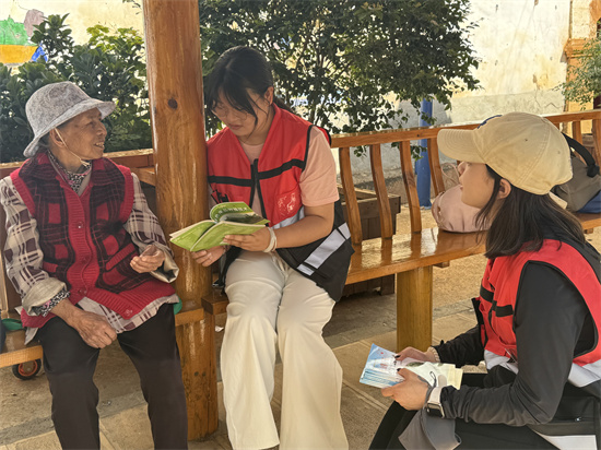 针对视力障碍老人获取信息不便的现状,团队精心准备了当日《云南日报》“民生聚焦”“康养资讯”等专题内容,以及《老人春秋》等适老化读物。专业教师与学生轮流为老人朗读,以清晰的语音、温和的节奏传递政策动态与生活常识,并耐心解答疑问、倾听老人心声。82岁的张爷爷感慨:“眼睛看不清很久了,听你们读报就像打开了‘有声窗户’,心里亮堂多了。”活动中,师生还向老人赠送了手写读书摘要卡片,鼓励持续保持阅读习惯,现场洋溢着温暖的文化氛围。