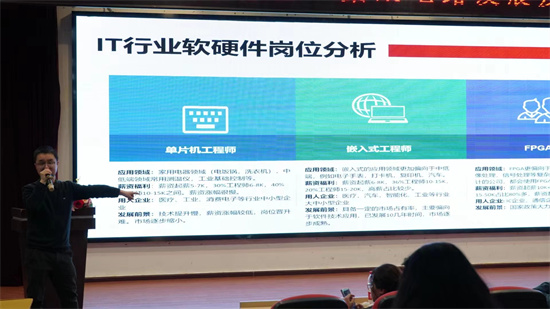 讲座由信息技术教研室主任马飞主持,邓总从芯片与生活息息相关、国家集成电路发展政策、全国集成电路产业重点城市以及目前IT行业与集成电路行业的岗位现状、FPGA行业的晋升发展等方面为同学们做了讲解,提升了学生的专业认知。同学们也与邓总积极互动,从未来工作的就业薪资到个人的核心竞争力等方面进行交流和探讨。鉴于同学们高涨的学习热情,邓总为同学们开放FPGA课程资料免费学习。