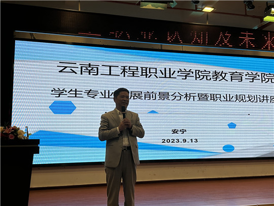 2023年9月13日,云南工程职业学院教育学院在我校阶梯三教室开展“学生专业发展前景分析暨职业规划讲座"。此次讲座旨在帮助同学们认识到所学专业、就业前景以及职业规划的关键性。教育学院邀请到深圳雏鹰教育集团董事长郭阳钰老师担任本场讲座的主讲人并为同学们提供职业规划指导。教育学院22级学前教育和中文专业的同学、学生科科长刘金晶以及各班辅导员参加此次讲座。