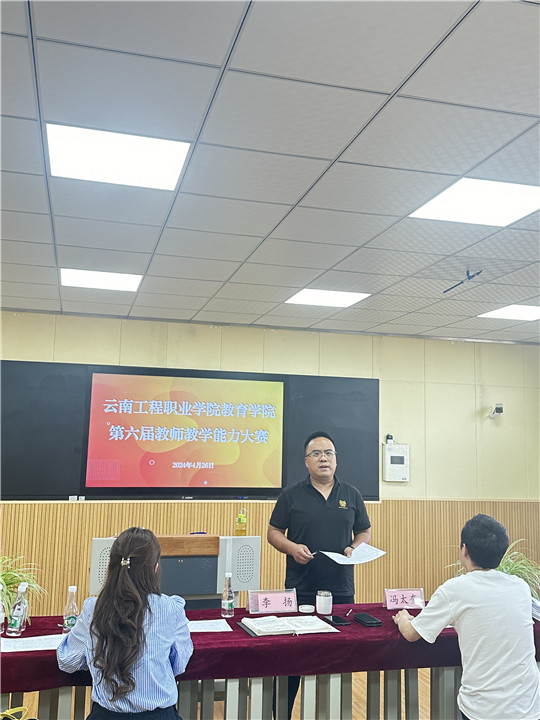 为深入学习贯彻党的二十大精神和习近平总书记关于职业教育工作的重要指示批示精神,落实立德树人根本任务,全面纵深推进清廉学校建设,立足于学校办学质量管理指标体系内容,深化“三教”改革,探索“岗课赛证”综合育人。坚持以赛促教、以赛促学、以赛促改、以赛促研,促进“能说会做善导”的“双师型”教师成长,同时做好校级及省级教学能力比赛的备赛工作,根据《云南工程职业学院关于举办第六届“铭鼎杯”教师教学能力比赛的通知》要求,2024年4月26日下午13:30,教育学院在1教614组织开展了云南工程职业学院第六届“铭鼎杯”教师教学能力大赛教育学院初赛。