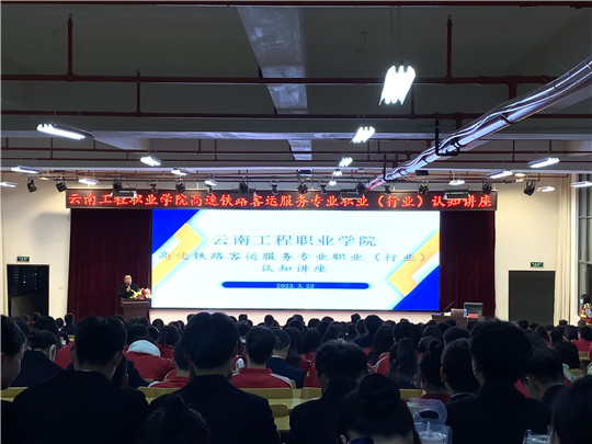为深入学习贯彻党的二十大精神,全国、全省职业教育大会精神,落实云南省委办公厅、省政府办公厅《关于推动现代职业教育高质量发展的意见》,切实提升学生对所学专业在行业与职业中的认识,树立良好的职业观和就业观,更好与企业接轨,增强职业体验感,提高就业竞争力。2023年3月22日晚上,教育学院邀请到中国铁路昆明局集团公司昆明客运段列车长何建波、赵莹静,在学校阶梯三教室为高速铁路客运服务专业在校学生开展职业(行业)认知教育讲座。教育学院院长张发品、副院长李扬,高速铁路客运服务专业全体专职教师、辅导员聆听了讲座。讲座由教育学院副院长李扬主持。